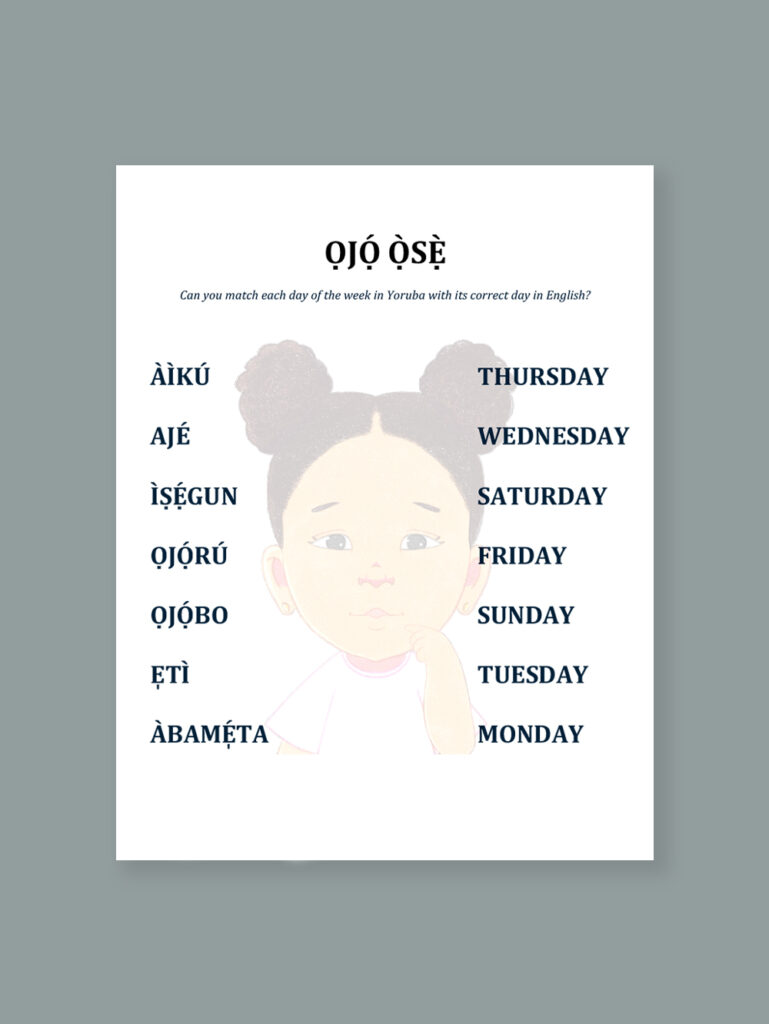 ỌJỌ́ ỌSẸ: Learn the days of the week (ọjọ́ ọ̀sẹ̀) in Yoruba! Match each one to its English pair.